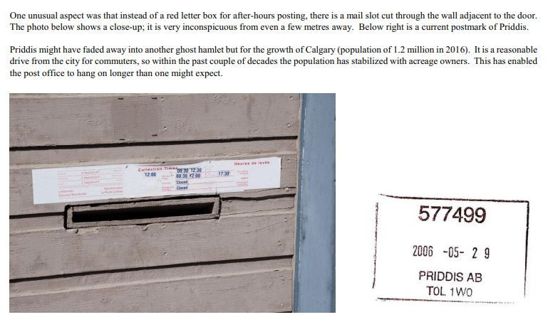 The Priddis name was based on mail delivery to and from the home of Charles Priddis. It used to be that the mail was left on his table within his home and each one sorted out his own. When a regular post office and mail service was requested, the authorities used the name Priddis as the mail was going to the Priddis shack and he was to be postmaster.